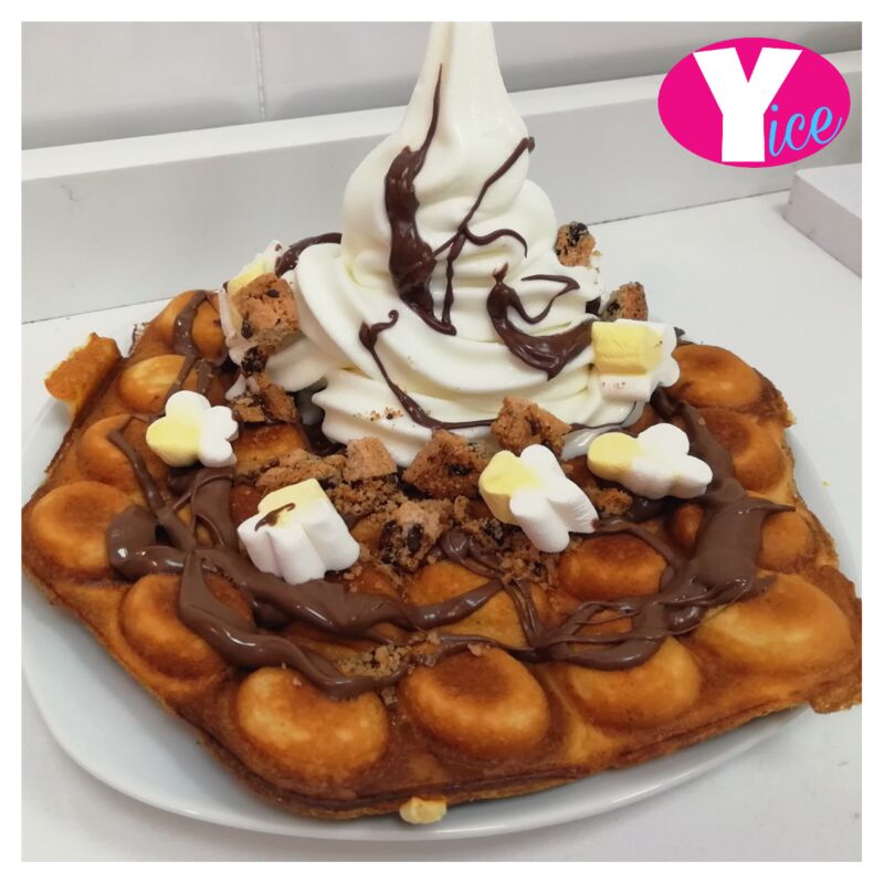 Delicioso waffle con esponjosas burbujas acompañado de un exquisito Yogurt o helado o Sunday Star (nata). Además, añádele tres toppings para hacerlo irresistible ?